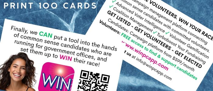 Our WIN App connects enthusiastic volunteers with common sense candidates running for a governmental position. To participate in our service, volunteers must truthfully sign and commit to the same principles the candidate committed to uphold once elected to office.